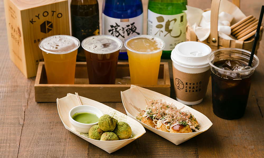 京都で焙煎された珈琲、挽いたお茶、醸造されたクラフトビール、日本酒、ワインなどのドリンクをご用意しております。また、ドリンクに合うたこ焼きやスイーツなどのフードもご用意してます。